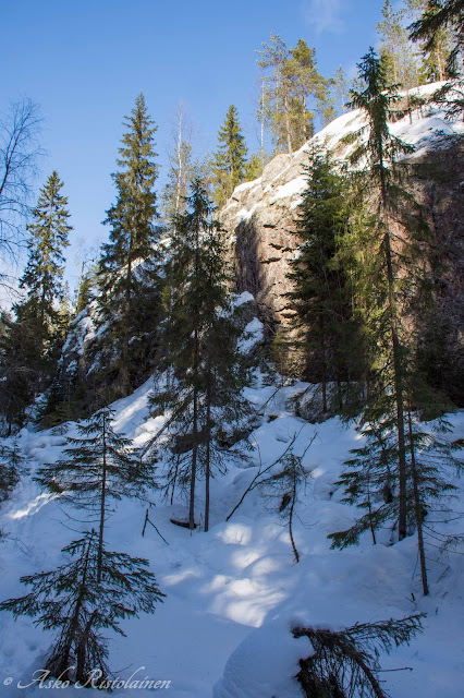 Rotkon päästä nousimme polkua pitkin jyrkänteen päälle ja lähdimme kävelemään takaisin päin. Itsesuojeluvaisto kehotti pysymään muutaman metrin päässä reunasta. Talvella ei voi tietää missä loppuu kallio ja missä alkaa pettävä lumilippa, joten on parempi ottaa varman päälle ja pysyä kauempana kuin tipahtaa 20m rotkoon.