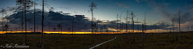 14 kuvan panoraama, jossa näkyy laskevan auringon kultaama taivaanranta sekä vastakkaisesta suunnasta noussut kuu. Harvoin jätän jalustan pois matkasta mutta tällä kertaa kuvittelin pärjääväni ilman sitä. Kuinka väärässä olinkaan? Panoraamakuvia ottaessa jouduin nojailemaan kelopuiden runkoihin tukea hakiessani. Ilman kohtuutonta herkkyyden nostoa valotusajat kasvat liian pitkiksi käsivaralta otettaviksi.
